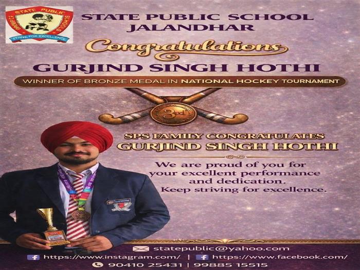 State Public School, Jalandhar is proud to announce that Gurjind Singh Hothi, a student of Class XII (Science), has brought great honor by winning the Bronze Medal at the Under-19 National Hockey Tournament. Competing against some of the best young hockey players from across the country, Gurjind displayed remarkable skill, teamwork, and sportsmanship throughout the tournament.